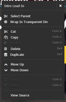 Click on the Html button at the bottom to bring up an html editor, here you can edit your projects html and see a live preview of your changes in the builder. Selecting a new element in the builder will highlight that element's markup in the html editor, you can also click view source in the right-click menu to show selected elements markup in the html editor.