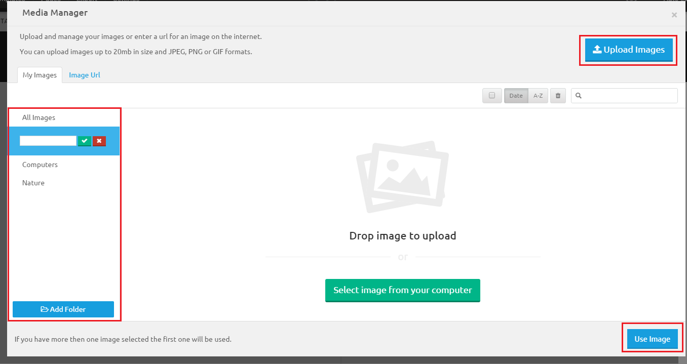In the My Images tab, you can create/edit and delete folders. You can use these folders to organize your images, once an image is uploaded to a folder it will not be visible in other ones.