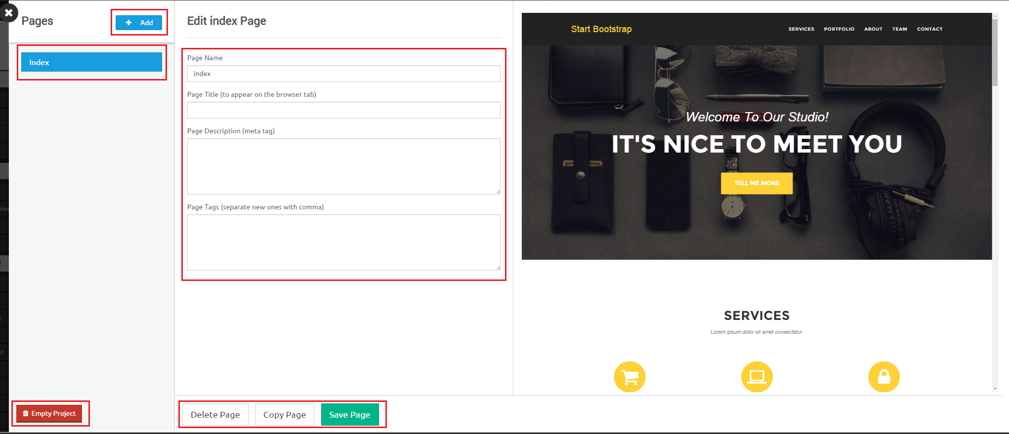 Clicking on red Empty Project button at the bottom will clear all html, css and javascript for all the project pages. So you can start with blank pages.