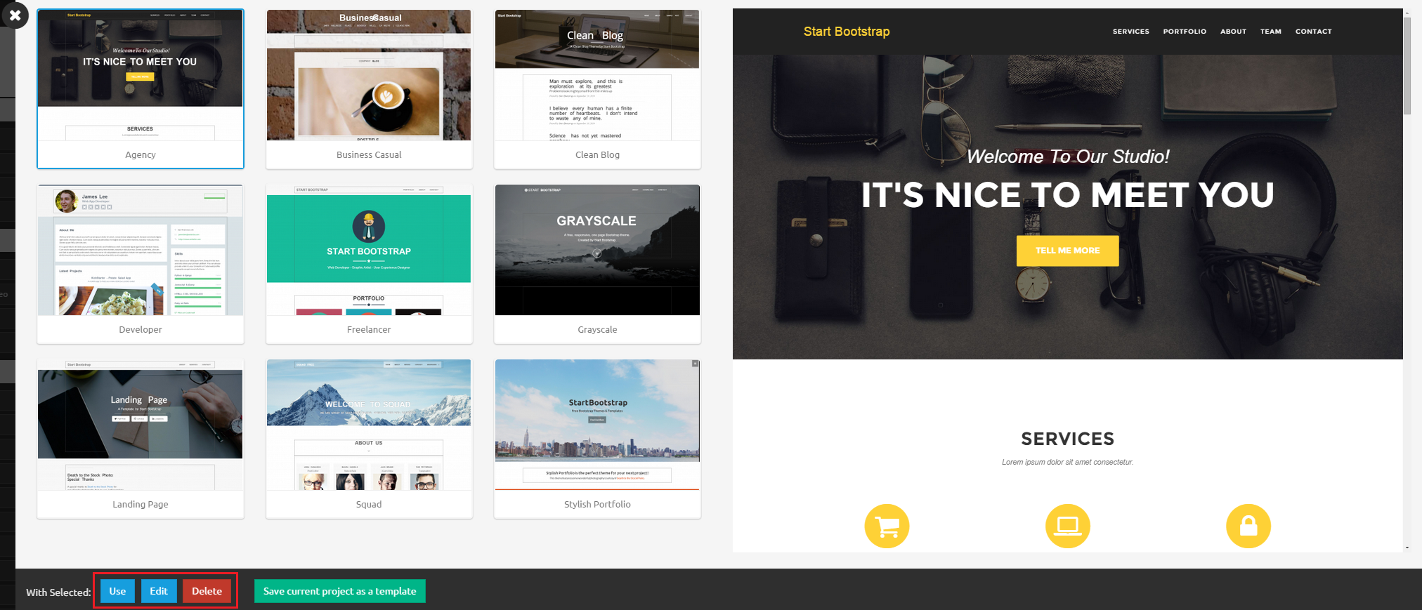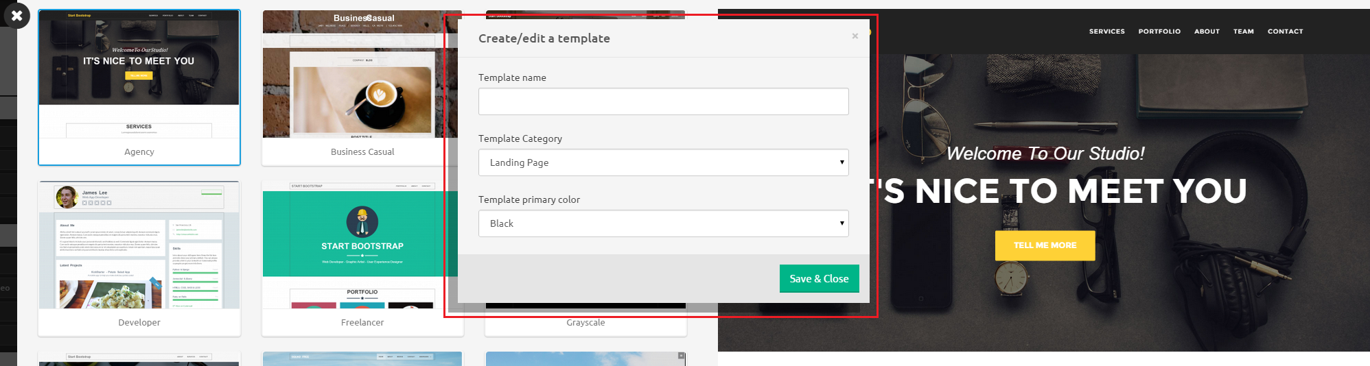 To create a new template, open templates panel and click on Save current project as a template at the bottom. This will open a modal, where you can enter your templates name, category and primary color. Once you click Save & Close your new template will be saved using your current projects css, html and js.