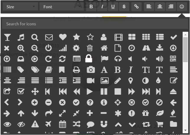 To insert an icon, position the carrot where you want to insert the icon, click the smiley face icon in the wysiwyg bar, find the icon you want and click on it.